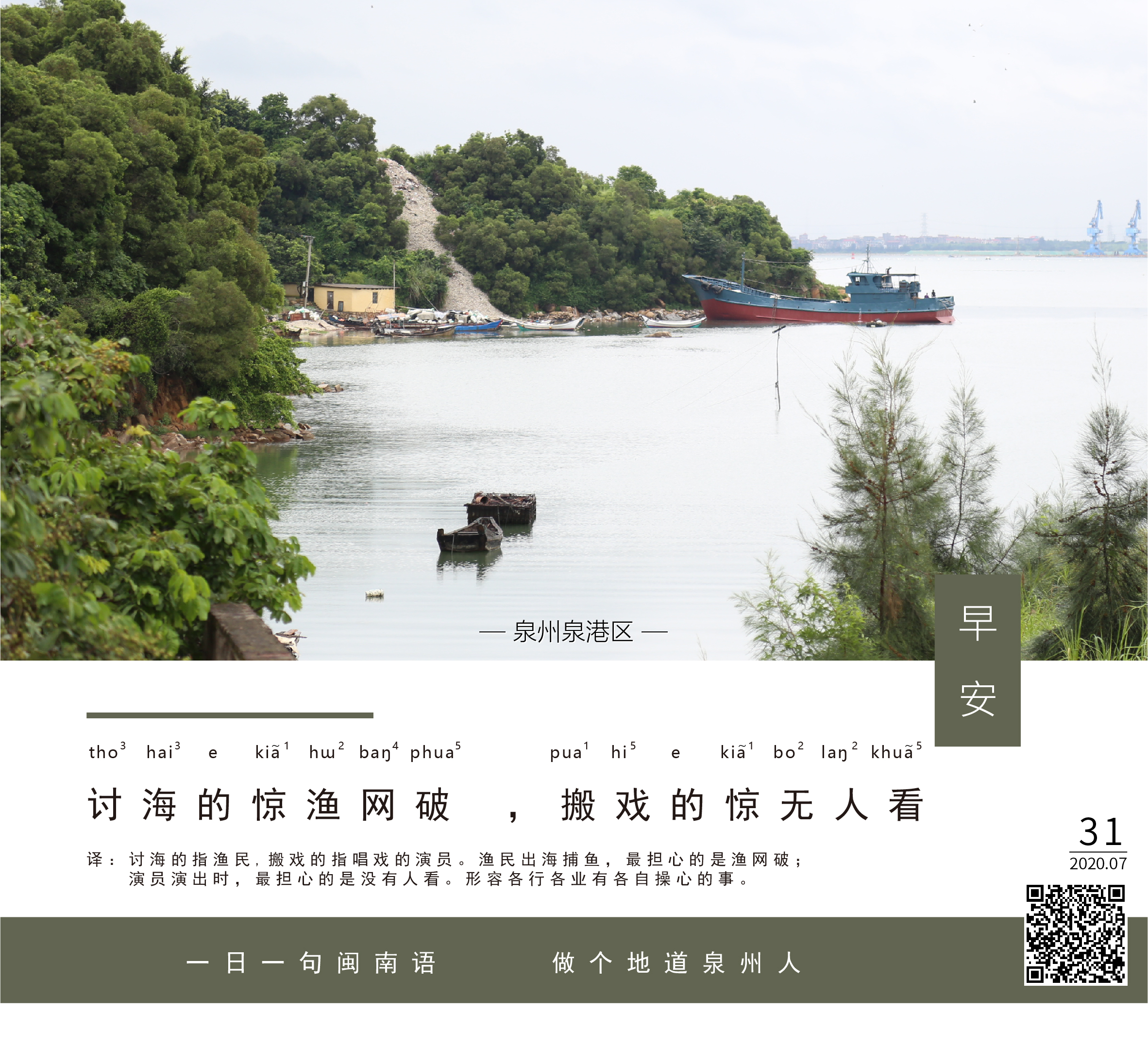 译:讨海的指渔民,搬戏的指唱戏的演员。渔民出海捕鱼,最担心的是渔网破;演员演出时,最担心的是没有人看。形容各行各业有各自操心的事。