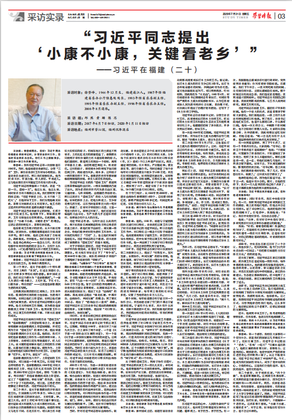 采访组:徐登峰同志,您好!习近平同志任福建省委副书记时,分管农业农村工作,您当时任省委农办主任。你们工作上接触很多,请您讲一讲工作开展情况。