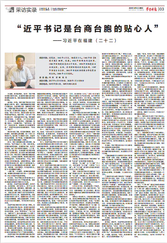 梁茂淦:1996年,习近平同志任福建省委副书记时,兼任省委对台工作领导小组常务副组长。他把在福州市工作时大量行之有效的对台工作经验带到了省里,并结合全省情况采取了许多创新举措。