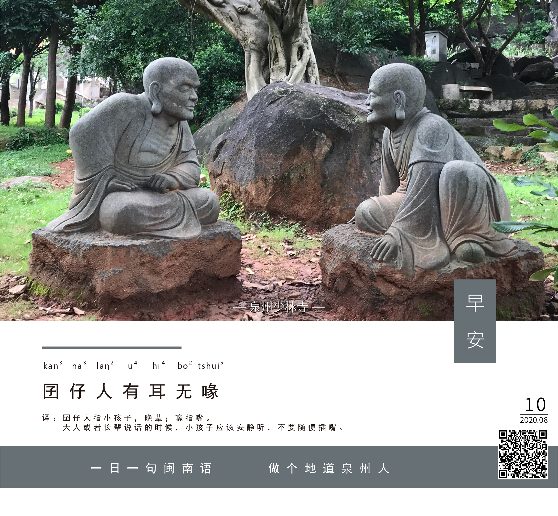 译:囝仔人指小孩子,晚辈;喙指嘴。大人或者长辈说话的时候,小孩子应该安静听,不要随便插嘴。