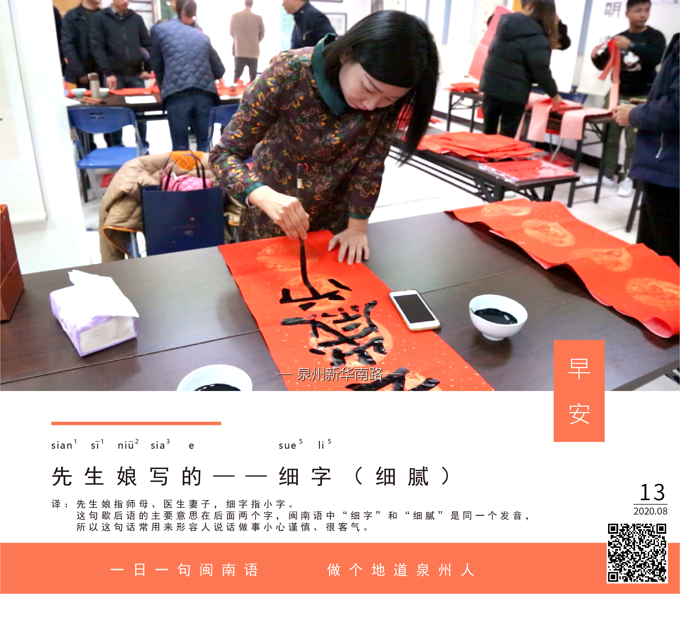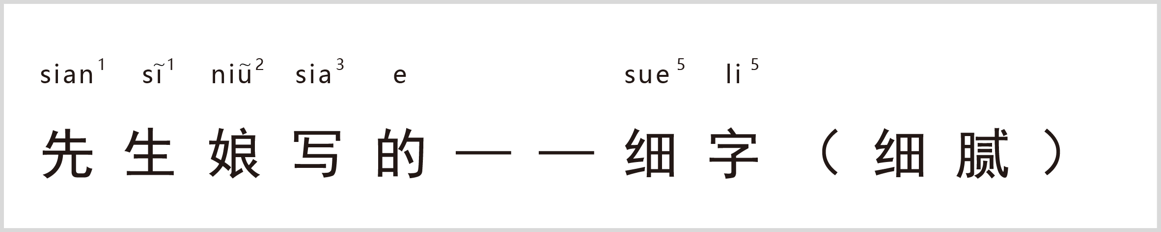 译:先生娘指师母、医生妻子,细字指小字。这句歇后语的主要意思在后面两个字,闽南语中“细字”和“细腻”是同一个发音,所以这句话常用来形容人说话做事小心谨慎、很客气。