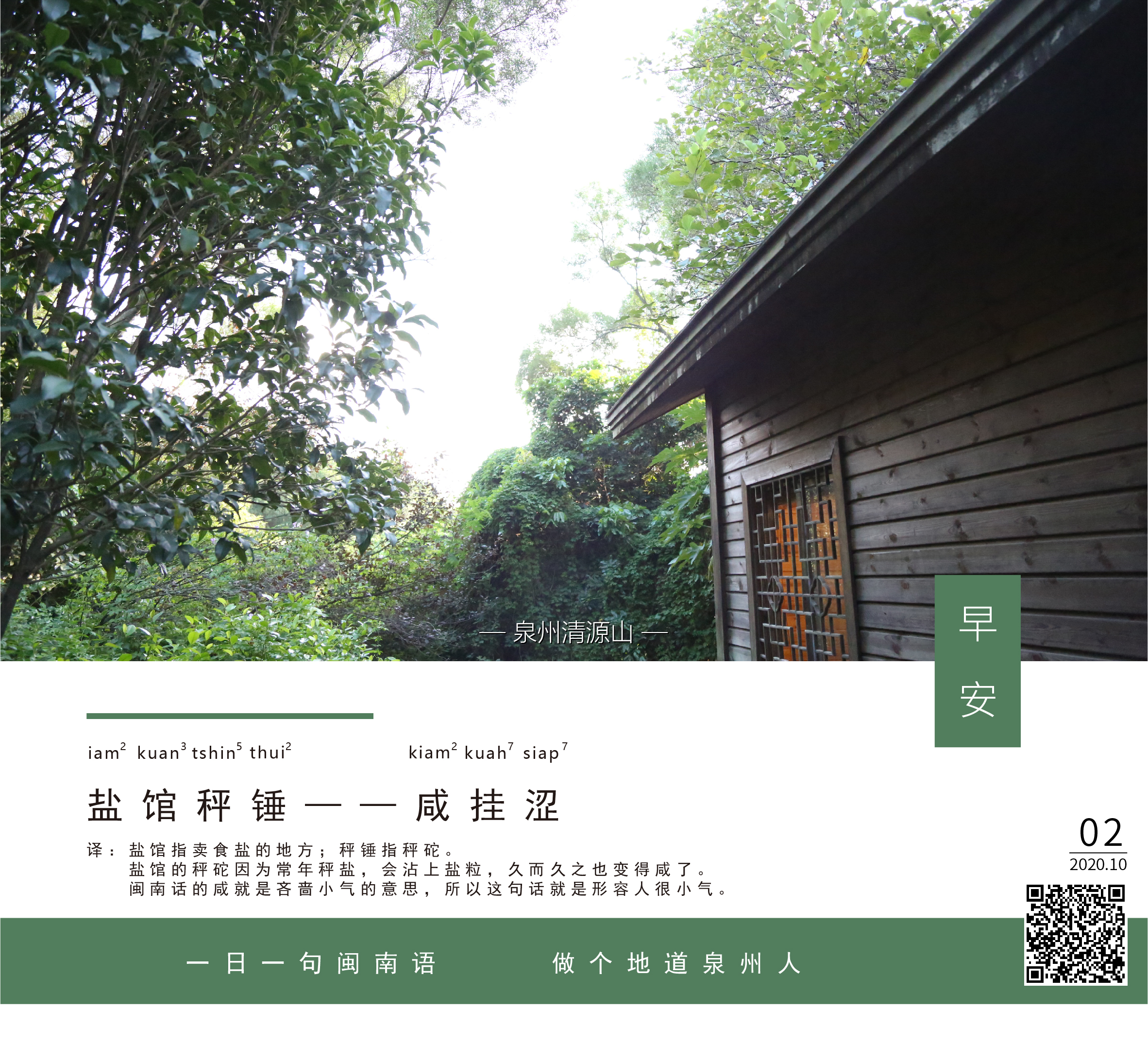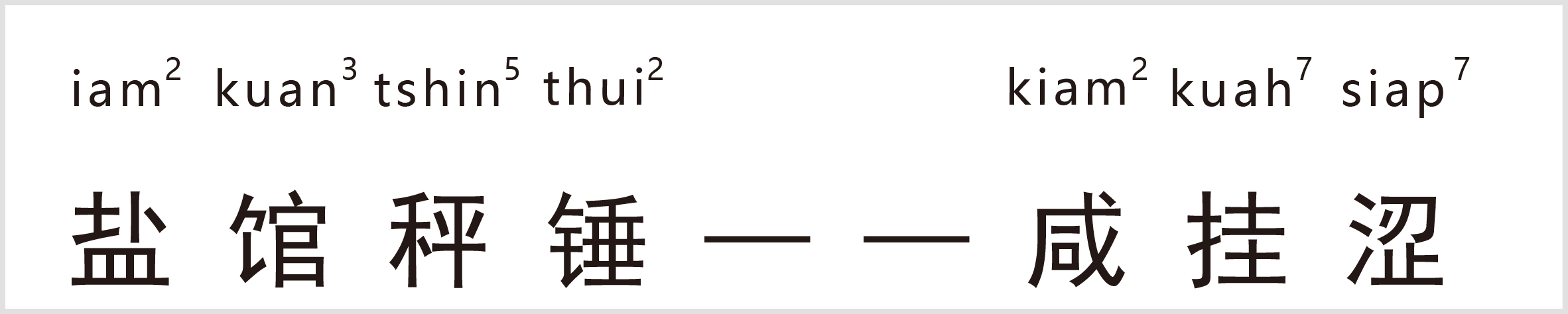 译:盐馆指卖食盐的地方;秤锤指秤砣。盐馆的秤砣因为常年秤盐,会沾上盐粒,久而久之也变得咸了。闽南话的咸就是吝啬小气的意思,所以这句话就是形容人很小气。
