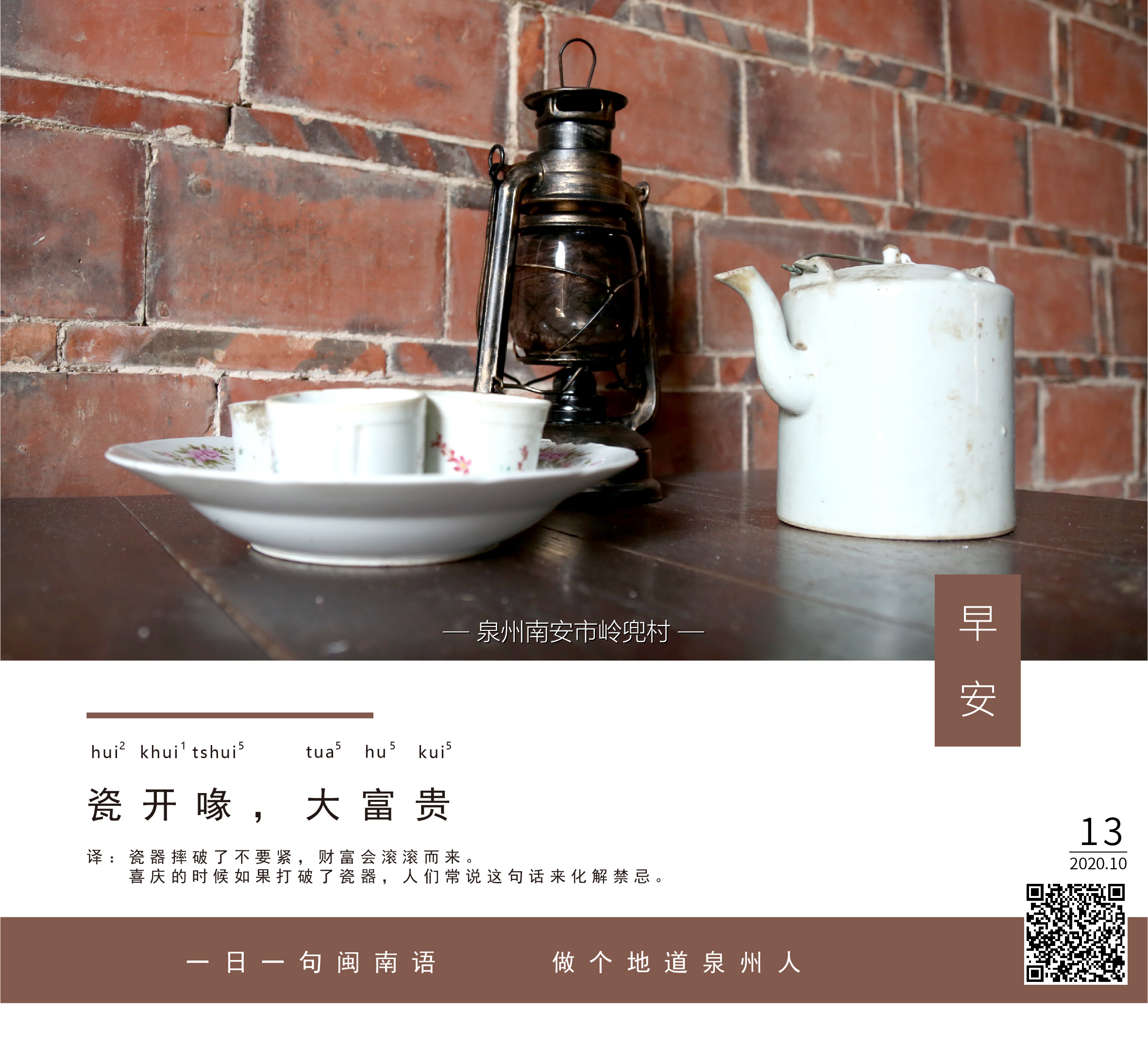 译:瓷器摔破了不要紧,财富会滚滚而来。喜庆的时候如果打破了瓷器,人们常说这句话来化解禁忌。