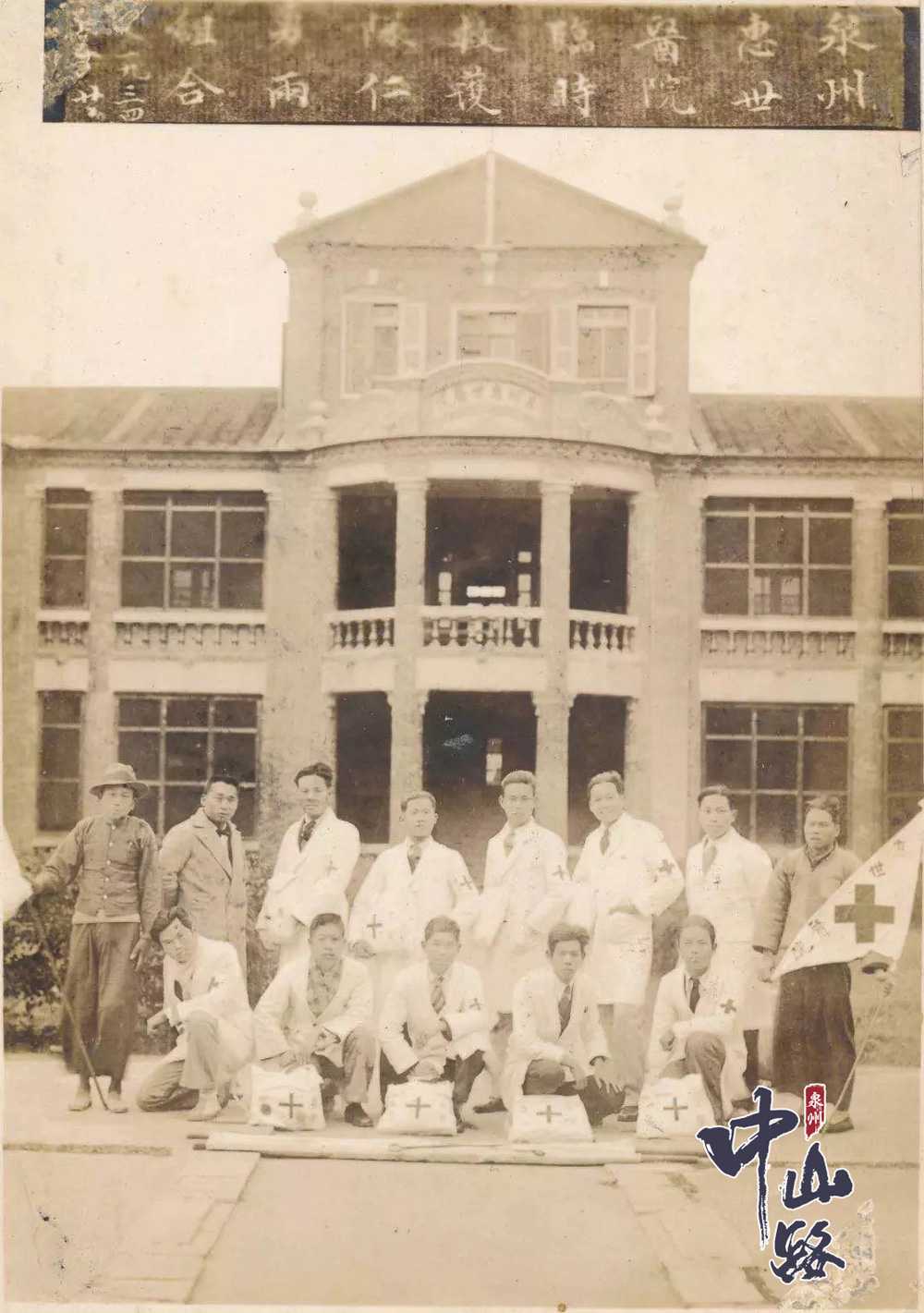 中山北路 惠世医院临时救护队仁勇两组合在1934年的合影,合影地点在惠世楼的门前,当地还是一片空地,如今这里建起了医院楼房。(黄方供图)