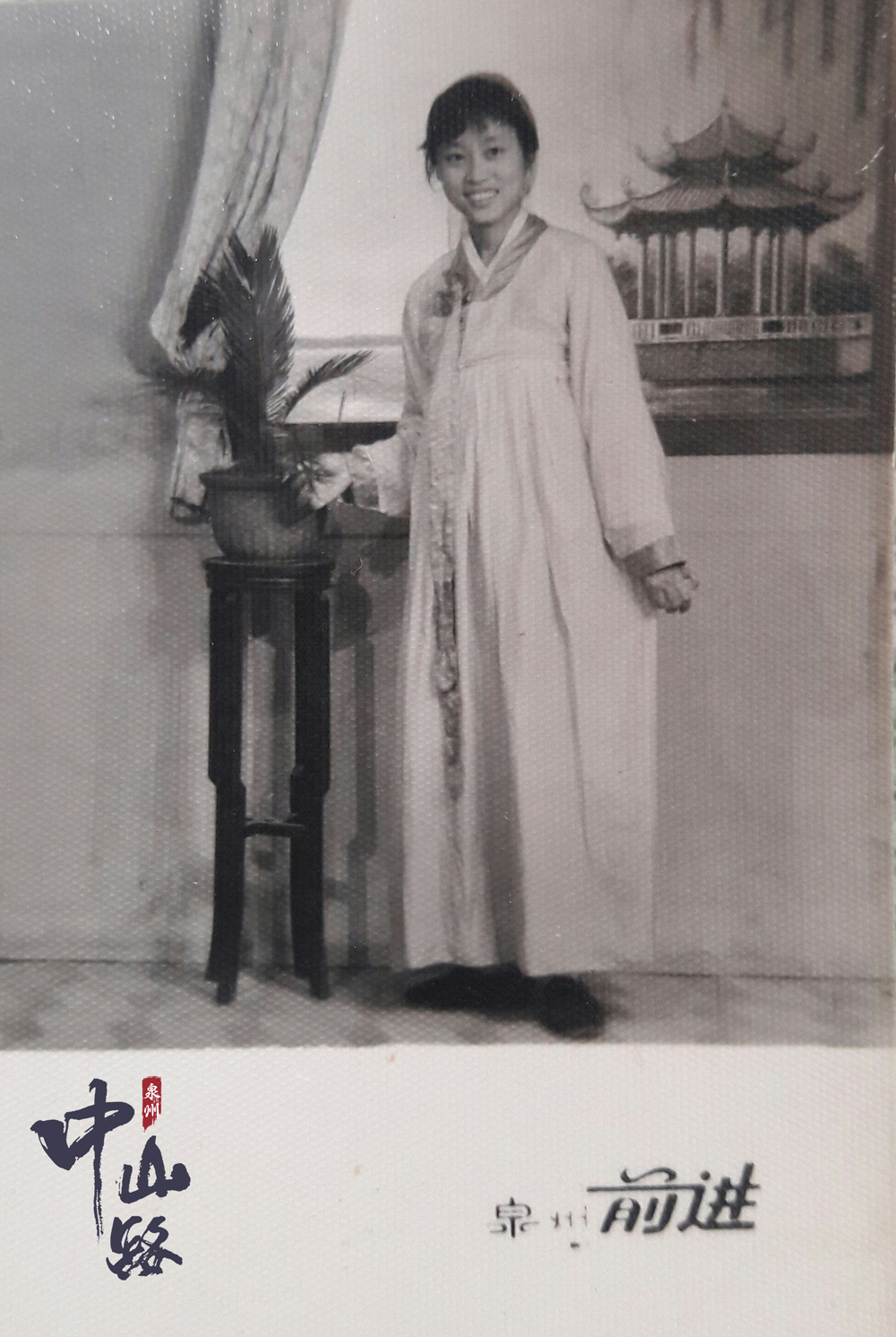 这是在前进(真宛然)照相馆拍摄的单人照,图中女子穿着照相馆提供的古装,背景图是泉州市工人文化宫百源川池的八角亭,这是当年人们在泉州最爱的拍摄背景之一。