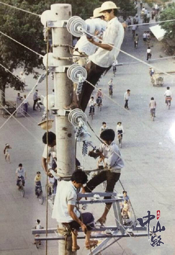 上世纪七八十年代,威远楼附近工人们检修电力设备。那时威远楼前的广场上还是清一色石板地面,行人不多,汽车没有。(蔡其呈摄)