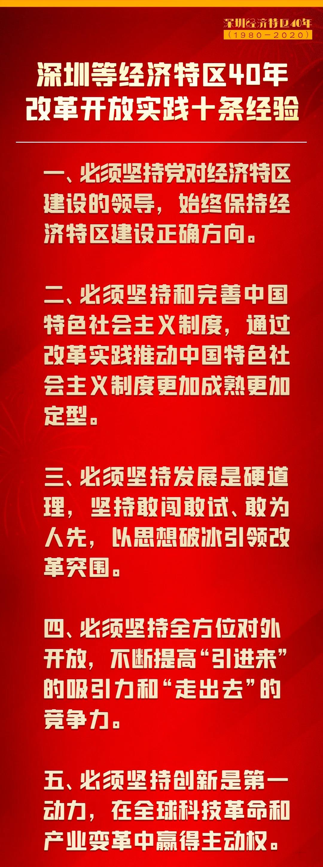 习近平强调,以上十条,是经济特区40年改革开放、创新发展积累的宝贵经验,对新时代经济特区建设具有重要指导意义,必须倍加珍惜、长期坚持,在实践中不断丰富和发展。