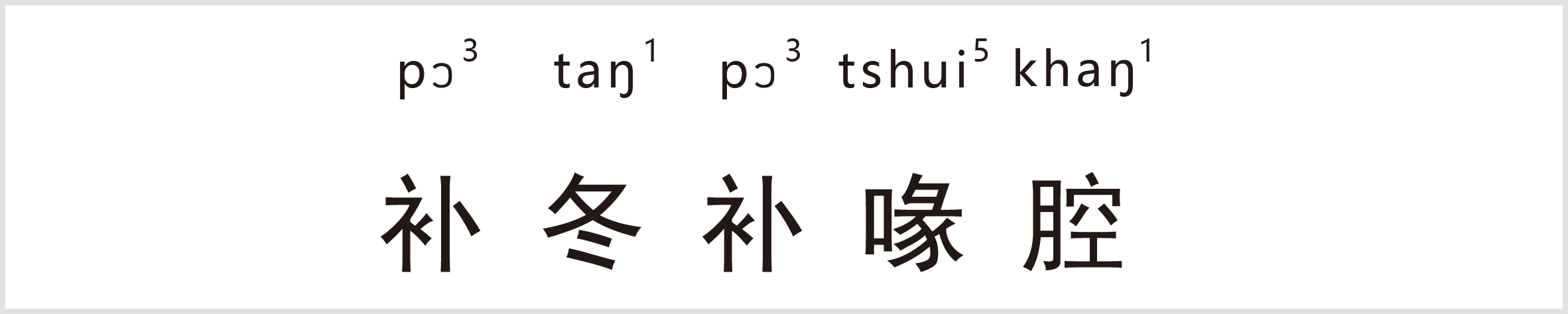 译:补冬指立冬进补;喙腔指嘴巴。闽南民俗立冬时节要进补才能滋养身体,实际上只是找借口来解解馋。也用来比喻巧立名目找借口。