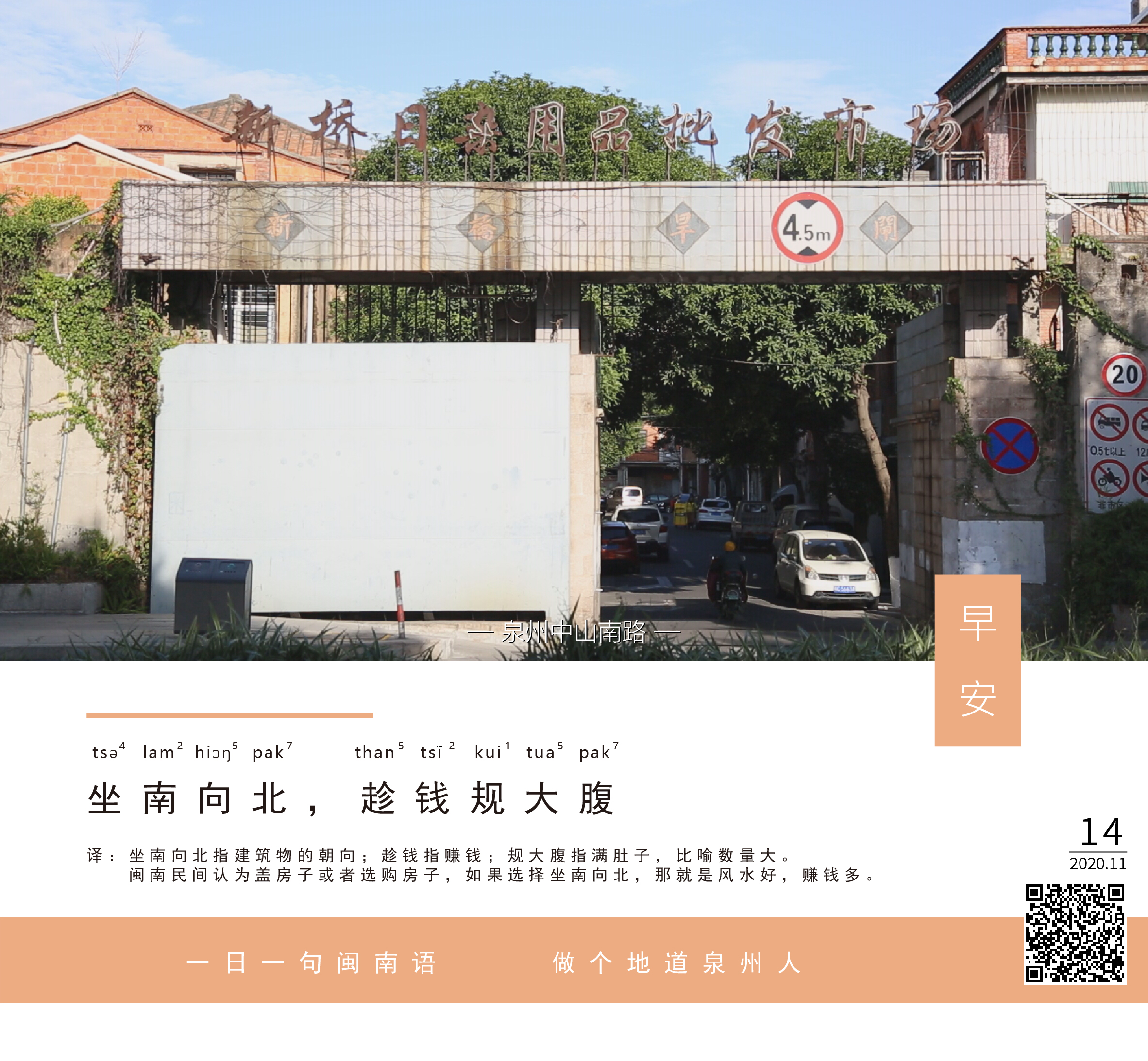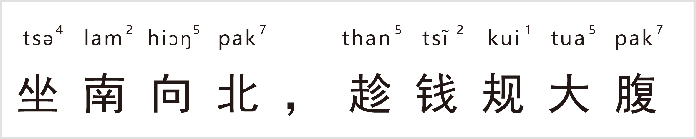 译:坐南向北指建筑物的朝向;趁钱指赚钱;规大腹指满肚子,比喻数量大。闽南民间认为盖房子或者选购房子,如果选择坐南向北,那就是风水好,赚钱多。