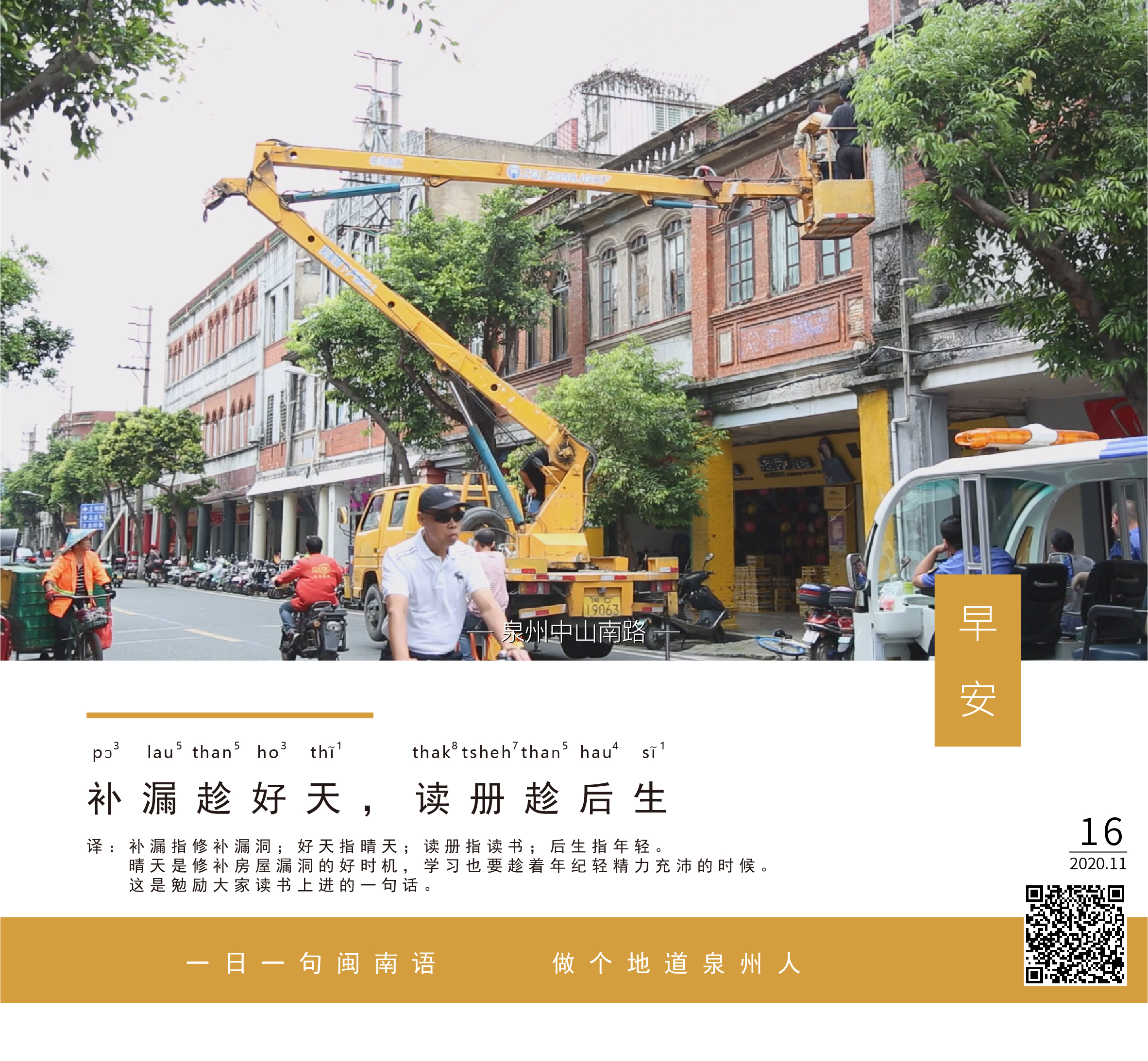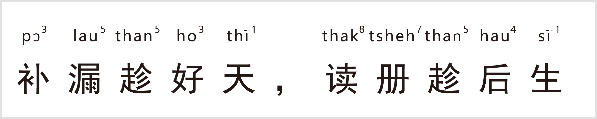译:补漏指修补漏洞;好天指晴天;读册指读书;后生指年轻。晴天是修补房屋漏洞的好时机,学习也要趁着年纪轻精力充沛的时候。这是勉励大家读书上进的一句话。
