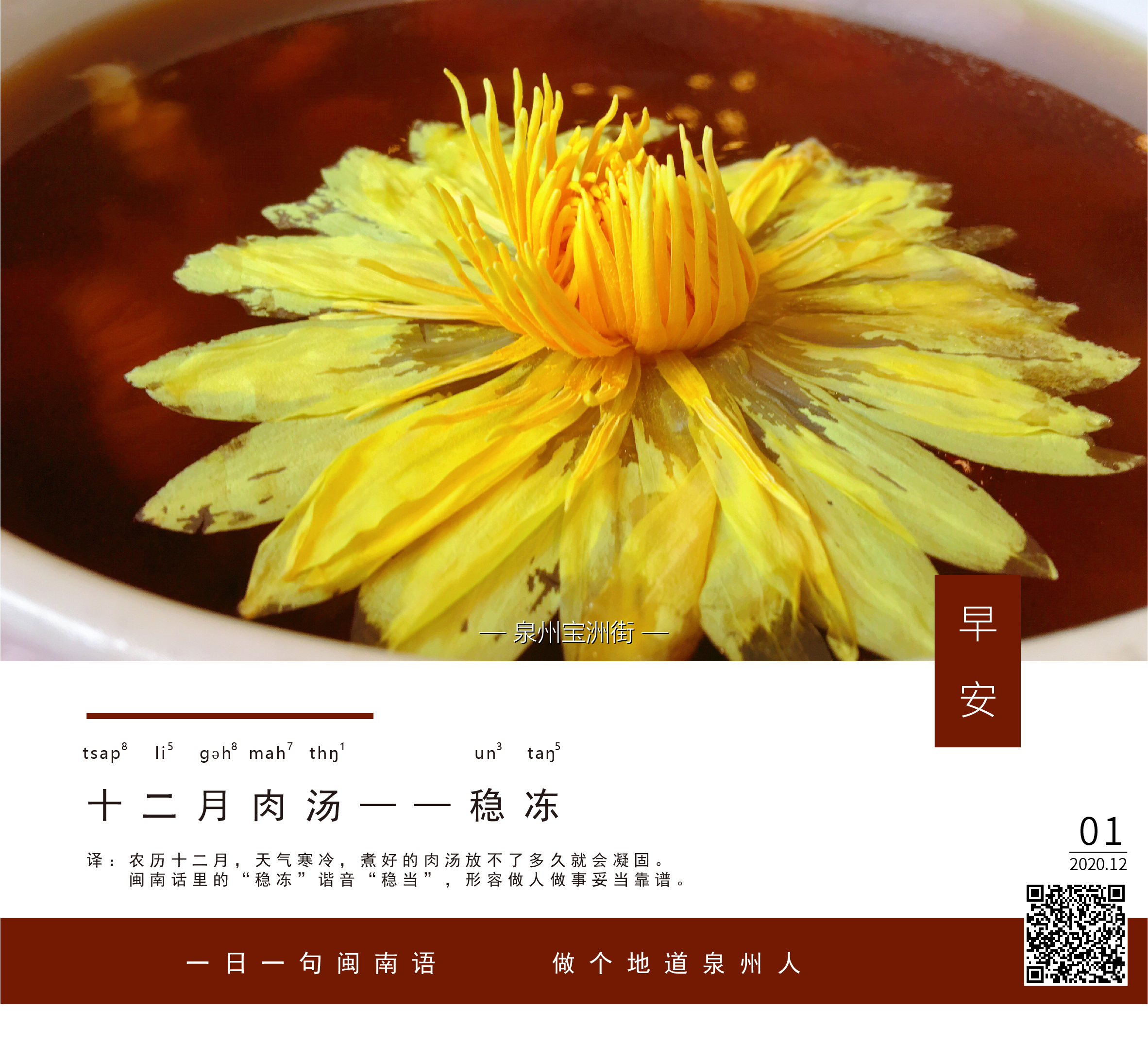 译:农历十二月,天气寒冷,煮好的肉汤放不了多久就会凝固。闽南话里的“稳冻”谐音“稳当”,形容做人做事妥当靠谱。