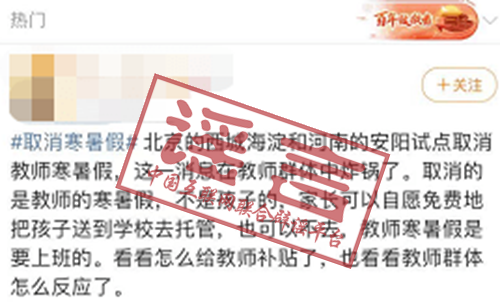 中国互联网联合辟谣平台第一时间向教育部相关部门求证,确认“北京、河南试点取消教师寒暑假”为不实消息。