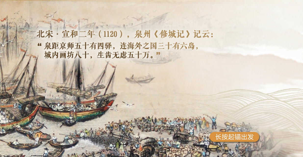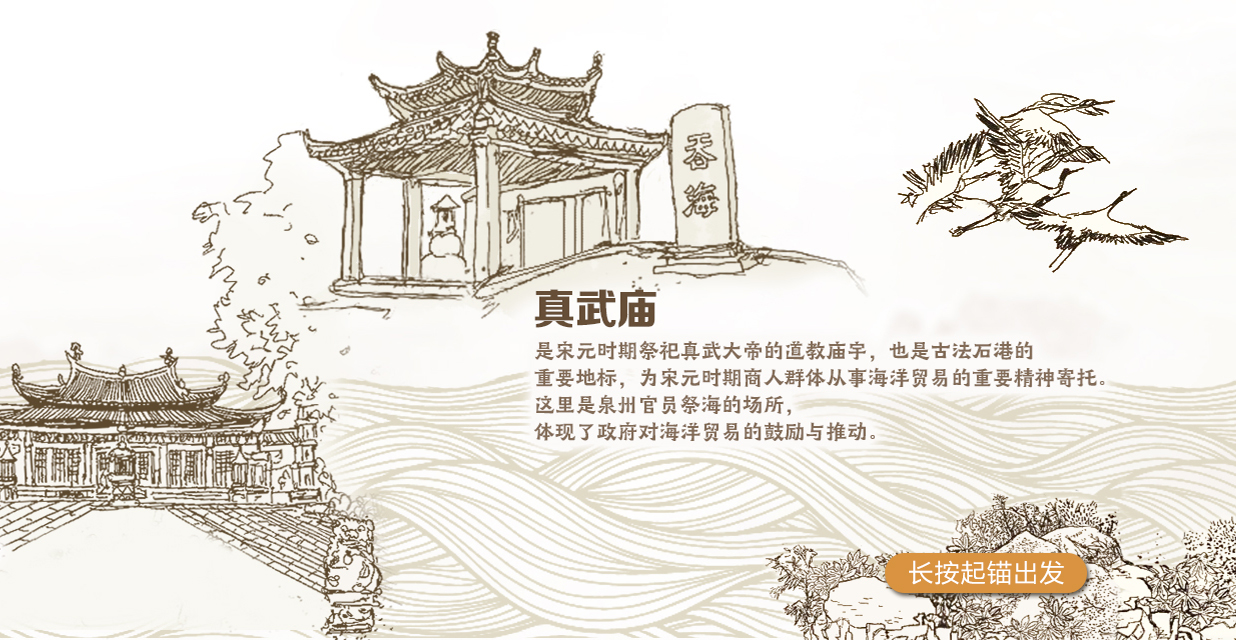 在《宋元泉州多元繁荣盛景图》中,读者可以画一艘独一无二的小船,再长按起锚键,这艘属于自己的小船将在韵味悠长的南音《山色》中扬帆起航,一路经过22个遗产点,每个遗产点都是一副精美的画作,配有简明扼要的文字,读者可以随时放开起锚键,详细品味,然后再次起锚,开始这段沉浸式的旅程。