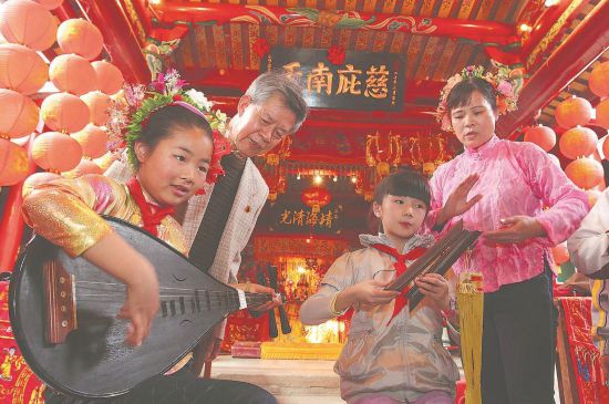 泉州市丰泽区蟳埔社区文化中心内,老人协会的南音老艺人教外来工子女演奏独特的南音乐器。