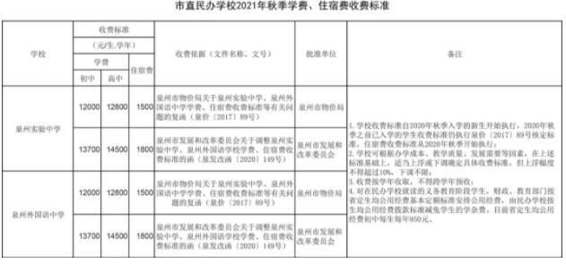 今年秋季泉州实验中学、泉州外国语中学收费标准自2020年秋季入学的新生开始执行,2020年秋季之前已入学的学生收费标准仍执行泉价〔2017〕89号核定标准,住宿费收费标准从2020年秋季开始执行;学校可根据办学成本、教学质量、发展需要等因素,在上述标准基础上,适当上浮或下调确定具体收费标准,但上浮幅度不得超过10%,下调不限;收费按学年收取,不得跨学年预收;对在民办学校就读的义务教育阶段学生,财政、教育部门按省定生均公用经费基本定额标准安排公用经费,由民办学校按生均公用经费拨款标准减免学生的学杂费。目前省定生均公用经费初中每生每年950元。