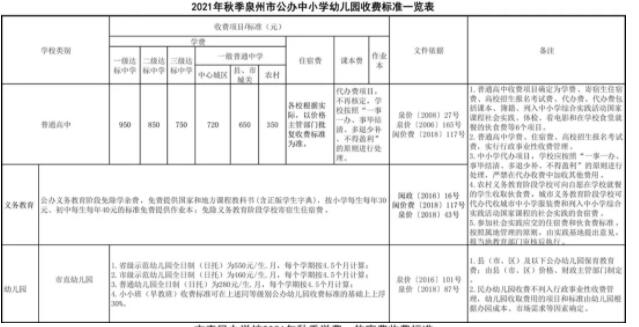 在新学年即将开学之际,24日记者从泉州市教育局了解到,2021年秋季泉州市中小学幼儿园收费标准公布了。相关文件不仅明确规定了公办中小学幼儿园收费项目与标准,同时明确了两所市直民办学校学费与寄宿生住宿费收费标准,让家长明明白白交费。