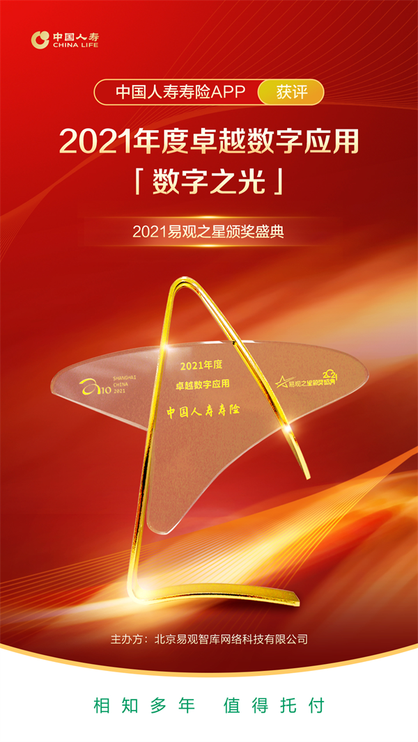 10月28日晚,“数字之光”2021易观之星颁奖盛典隆重举行。前期,组委会从第三方视角对参评企业在数字化升级进程中的竞争潜力、运营水平、投资价值以及用户基础等维度进行考察,综合考量企业的数字化发展实力,并进行了排名。奖项用于表彰在数字经济蓬勃发展进程中守正出新的典范。中国人寿寿险APP(以下简称“寿险APP”)首次参与评选,最终荣获“2021年度卓越数字应用”奖项。