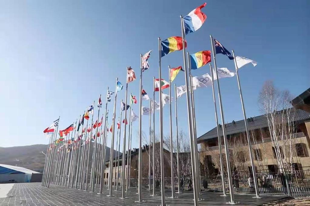 2021年12月22日,张家口冬奥村口飘起各参赛代表团旗帜。新华社记者杨帆摄