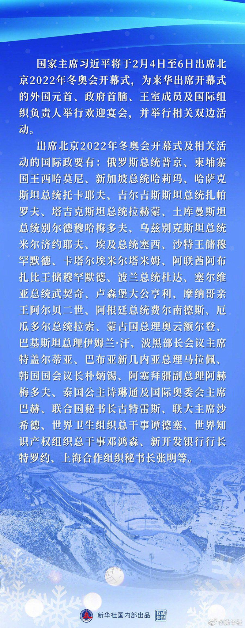 细看这份名单不难发现,出席北京冬奥会开幕式的各方来宾具有广泛代表性:从非洲到拉美、从亚洲到欧洲皆有,还有联合国、世卫组织等国际组织负责人。在新冠肺炎疫情全球肆虐的大背景下,这份名单充分表明世界对中国的信任与支持,也考验着中方在复杂严峻形势面前的防疫和办赛水平。