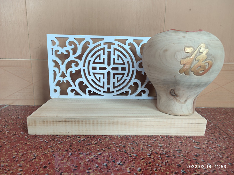 作品通过镂空、篆刻等技法将“福”、"禄"、"寿"连在一起,笔、尺等放入梅花囗的倒葫芦,配上寓意“寿”的团字与云理纹,表达出“福禄连理”的美好祝福。