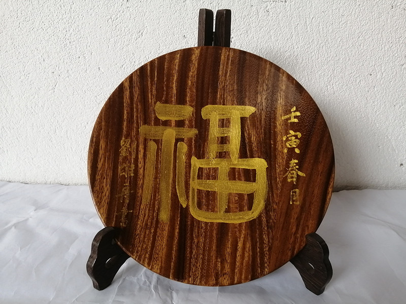 作品材质为南美胡桃木,以传统木旋技艺制作完成,盘中书写“福”字,盘体为圆盘,寓意:中华民族繁荣昌盛,民族团结,圆满幸福。