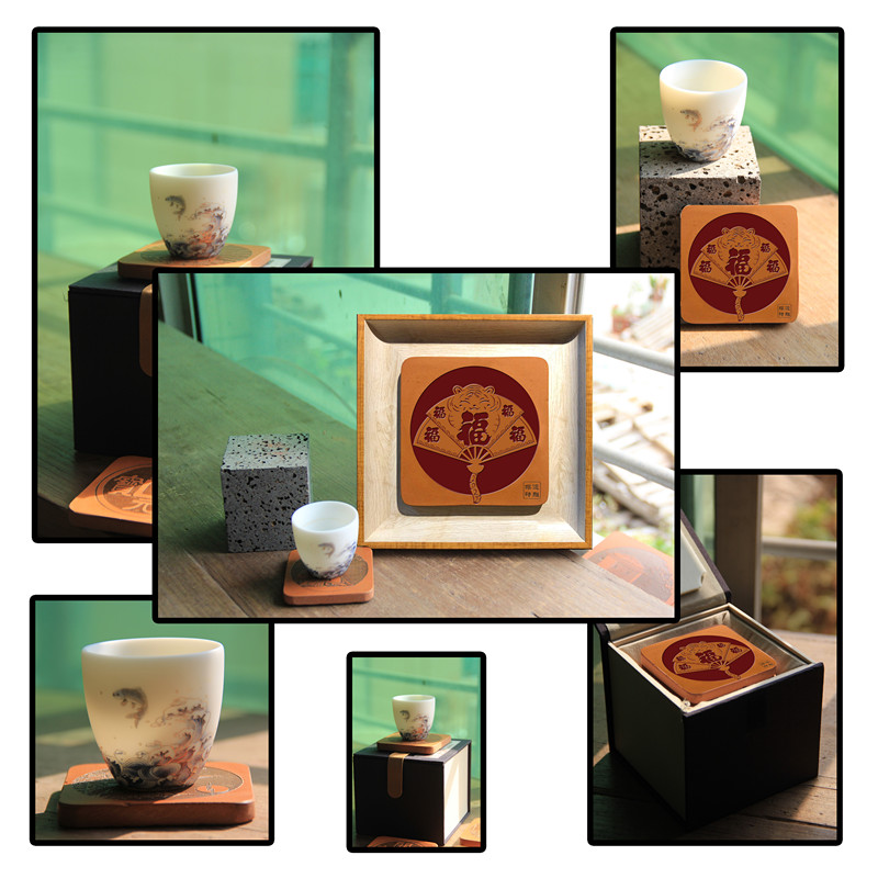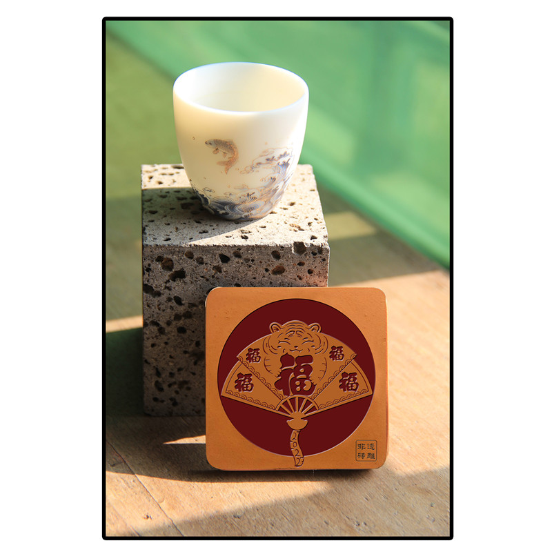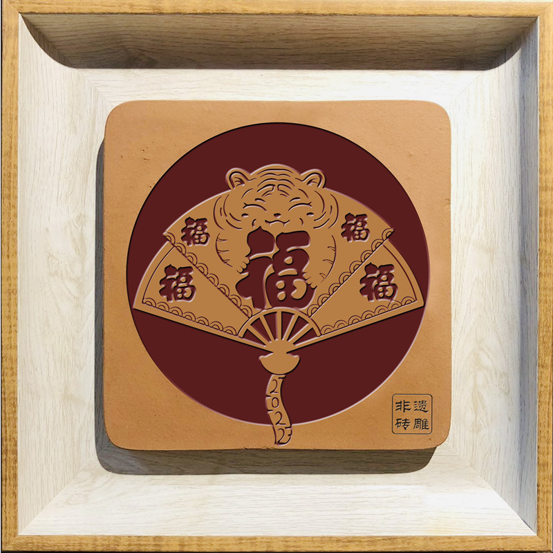 该作品是兼具摆件和杯垫功能的家居摆件。“虎年福见,闽红福气”,闽南红砖红色喜庆的色泽,经过精心雕刻体现出五福、抱福、善福的美好寓意,增添节日的喜庆气氛。