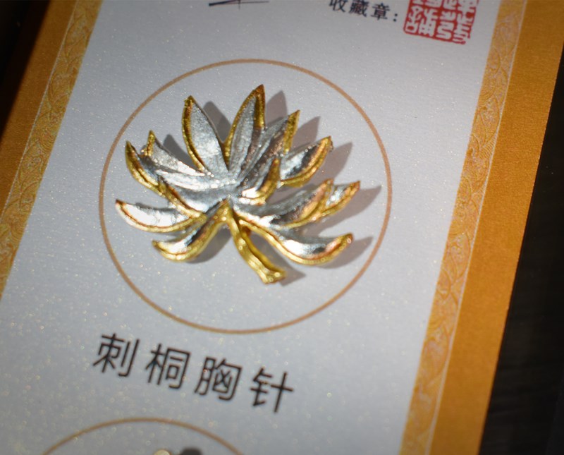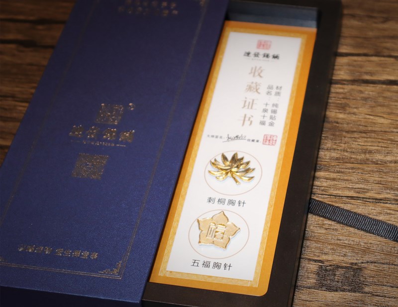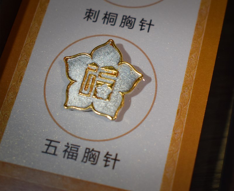 《十泉十福》胸针(男、女士通用款)在设计上融入了两款代表性主题元素:水仙花、刺桐花。水仙花是福建的一个象征,花语“万事如意、花开福至”,五瓣盛开的花瓣对应五福。水仙花图案位于“福”造型的“田”字格中,以“福生田亩”的意象体现福建之富饶,也寓意“福在福中,有福之地”。刺桐花是泉州市市花,长得花繁叶茂、花红似火,名闻海内外。它的寓意是:红红火火,吉祥富贵,充满了人们对未来的美好希望。