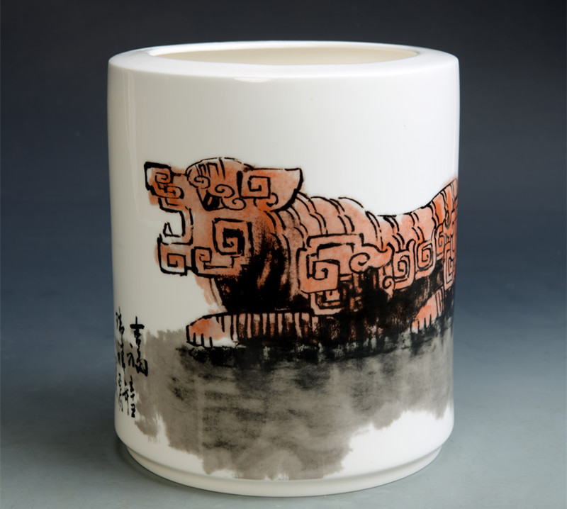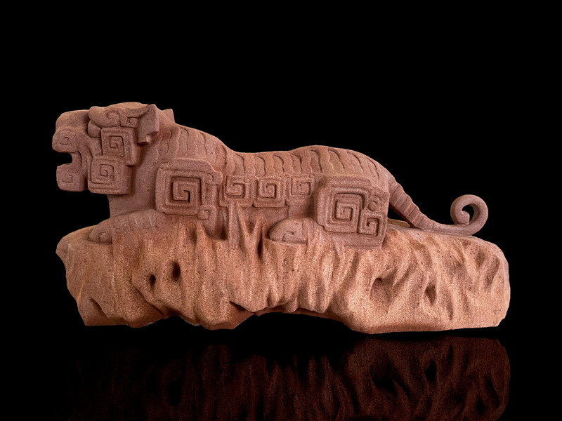 作者构思的猛虎卧于磐石之上,老虎首尾微扬,双目炯炯有神,气势逼人,身体两侧的须发则以传统元素“回字纹”装饰点缀——作品以虎年之“虎”谐音“福”,寓意大展宏图、福禄双全。