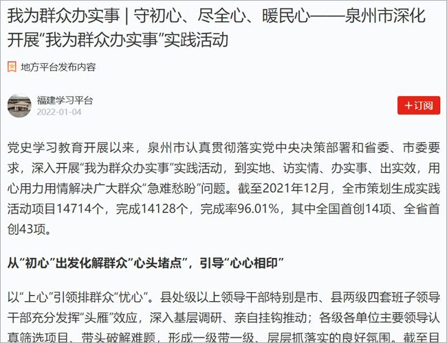 党史学习教育开展以来,福建省泉州市认真贯彻落实党中央决策部署和省委、市委要求,深入开展“我为群众办实事”实践活动,到实地、访实情、办实事、出实效,用心用力用情解决广大群众“急难愁盼”问题。截至2021年12月,全市策划生成实践活动项目14714个,完成14128个,完成率96.01%,其中全国首创14项、全省首创43项。