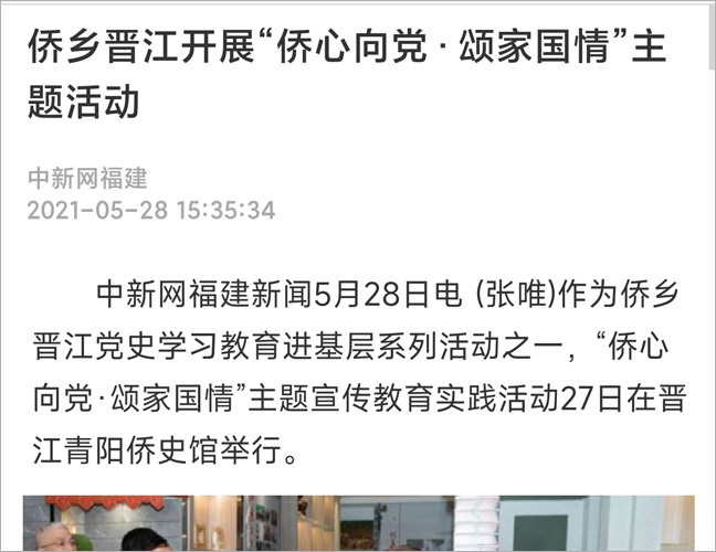 作为侨乡晋江党史学习教育进基层系列活动之一,“侨心向党·颂家国情”主题宣传教育实践活动27日在晋江青阳侨史馆举行。