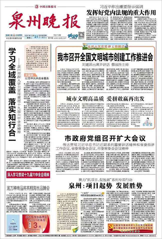 以史为鉴,方能开创未来。泉州将贯彻落实十九届六中全会精神与深入开展党史学习教育密切结合,以学促干、以干践行,深入践行以人民为中心的发展思想,在“我为群众办实事”“我为企业解难题”“我为社会做好事”主题实践活动的不断深化中,密切回应企业群众愿望呼声,让泉州人民的幸福更有温度和质感。