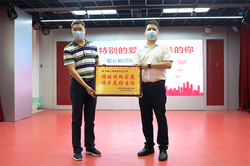 南安国寿参与承办关爱特殊家庭子女系列活动,图为南安市特殊教育学校校长赠送“情暖特殊家庭 携手美好生活”牌匾