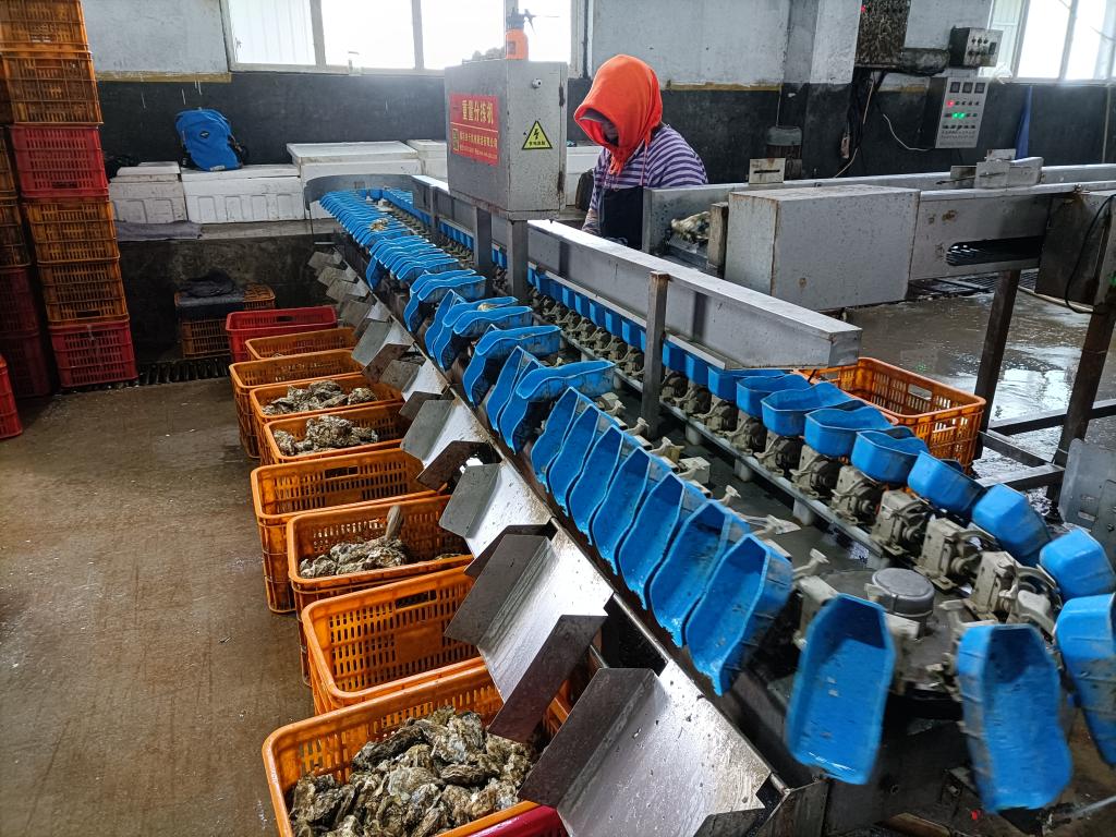 初步清理后的生蚝被送进公司在岛上的厂房里,经过自动化的清洗、按重量分拣等程序,保温打包后发往全国各地。