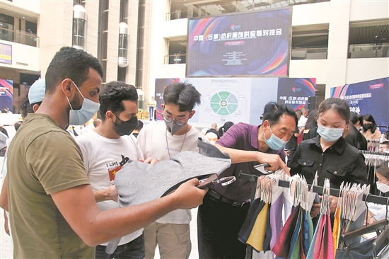 4月26日,中国(石狮)纺织服饰供应链对接会(线上云展)在石狮国际轻纺城A区中庭举行。(郭雅霞 摄)