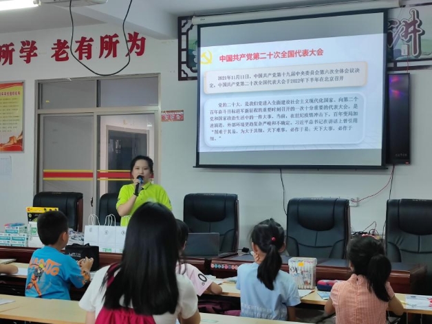 图为实践队员向“儿童之家”的小朋友们介绍二十大。