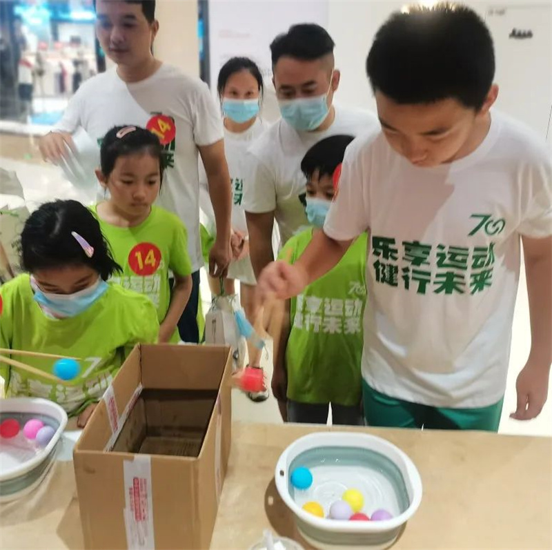 50组家庭参与了本次活动。现场设置了两人三足、尖叫指压板、亲子跳跳跳、魔力呼啦圈、“筷”运乒乓、趣味投壶6个游戏,家长和孩子合作“闯关”,在趣味挑战中,收获了亲子互动温情,也体验了运动快乐。