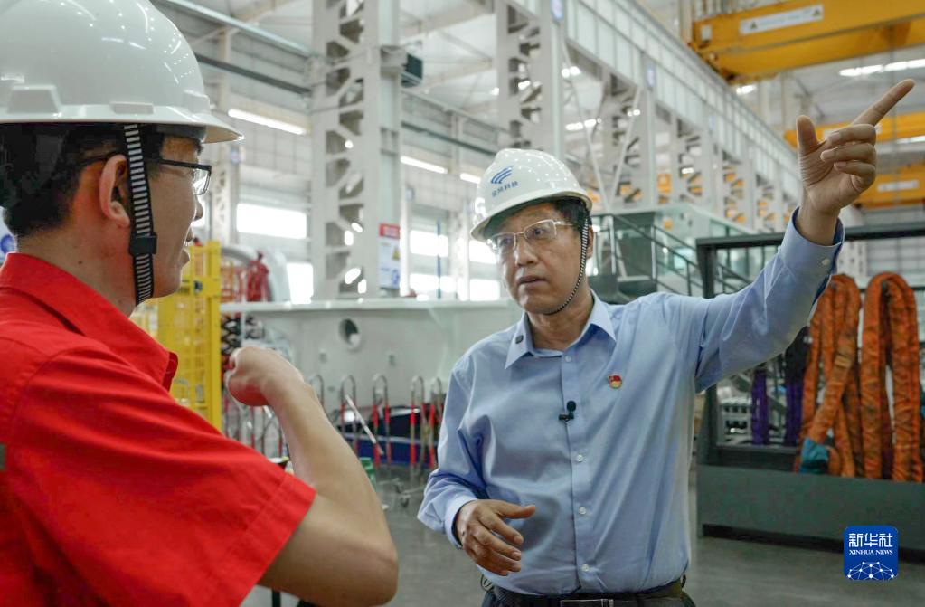 在金风科技新疆达坂城风电装备产业基地零碳智能工厂内,武钢(右)与技术工程师在一起交流(2022年8月6日摄)。新华社发