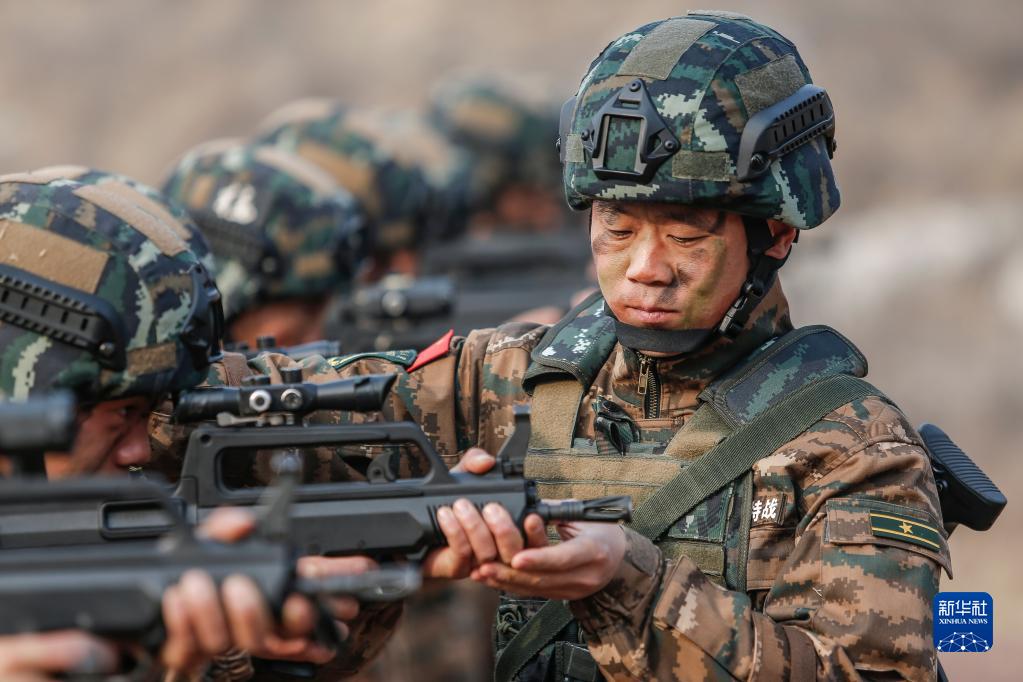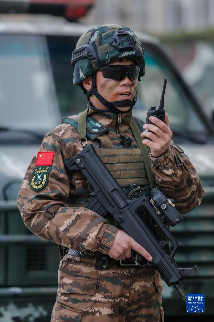 武警河北总队某部大队长李闯在演练中下达任务指令(2021年3月4日摄)。新华社发(张丹 摄)