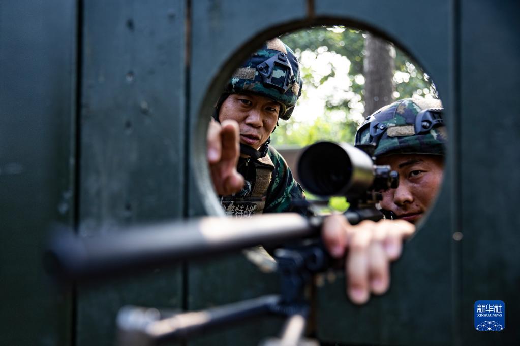 武警河北总队某部大队长李闯(左)指导特战队员狙击训练(2022年8月3日摄)。新华社发(江腾 摄)