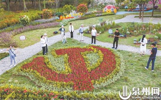 连日来,泉州社会各界以多种形式庆祝党的二十大胜利召开。图为近日在泉州市山线绿道桃源谷举行的花境微景观竞赛中,由花卉构成的党徽标志景致,吸引不少市民参观。