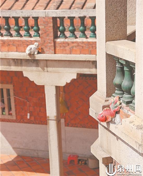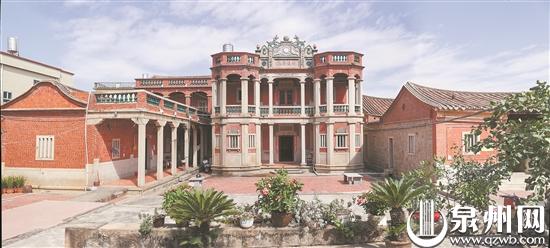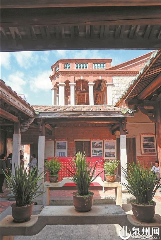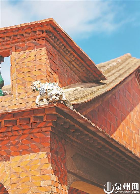 惠安县辋川镇峰崎村的“利通南海”楼,以中西合璧的风格建造,就像一座穿着洋装的红砖楼,砖雕、瓷雕、影雕、木雕等闽南传统建造技艺都交融在这幢楼中。