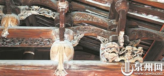 近日,记者来到景新堂,该楼为闽南典型的五间张双落双护大厝。建筑明间缝以木构承重,山墙面硬山搁檩造,外立面也是典型的红砖白石燕尾脊的闽南建筑造型。下落敞口厅的面阔比顶落的更大,中间增加两幅插梁式构架,圆作,用料硕大。