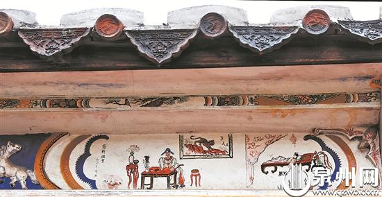 该厝的柜台脚、柱础以白石浅浮雕,一对石构门簪浮雕竹、鹿、松鹤等。水车堵将彩画与灰塑结合,展示了《三国演义》里大量的经典故事,辅以山水花鸟,造型逼真,色彩鲜艳。屋子上的剪粘与软陶装饰,更让建筑增色不少。