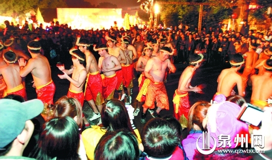 踩街是泉州的传统民间艺术,从古代元宵节的迎神赛会活动演变而来的。清《温陵岁时记》载:“上元前后夜间,好事者或摘某诗句、某传奇,饰稚小儿童,装扮故事,导以火把鼓吹,爆竹盈耳,游行市上,谓之妆人。”