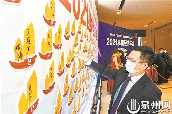 与会嘉宾将名字或祝福语写在福船上,一起贴在签到墙上,形成2021泉州经济年会特别的一幕。 (陈起拓 摄)