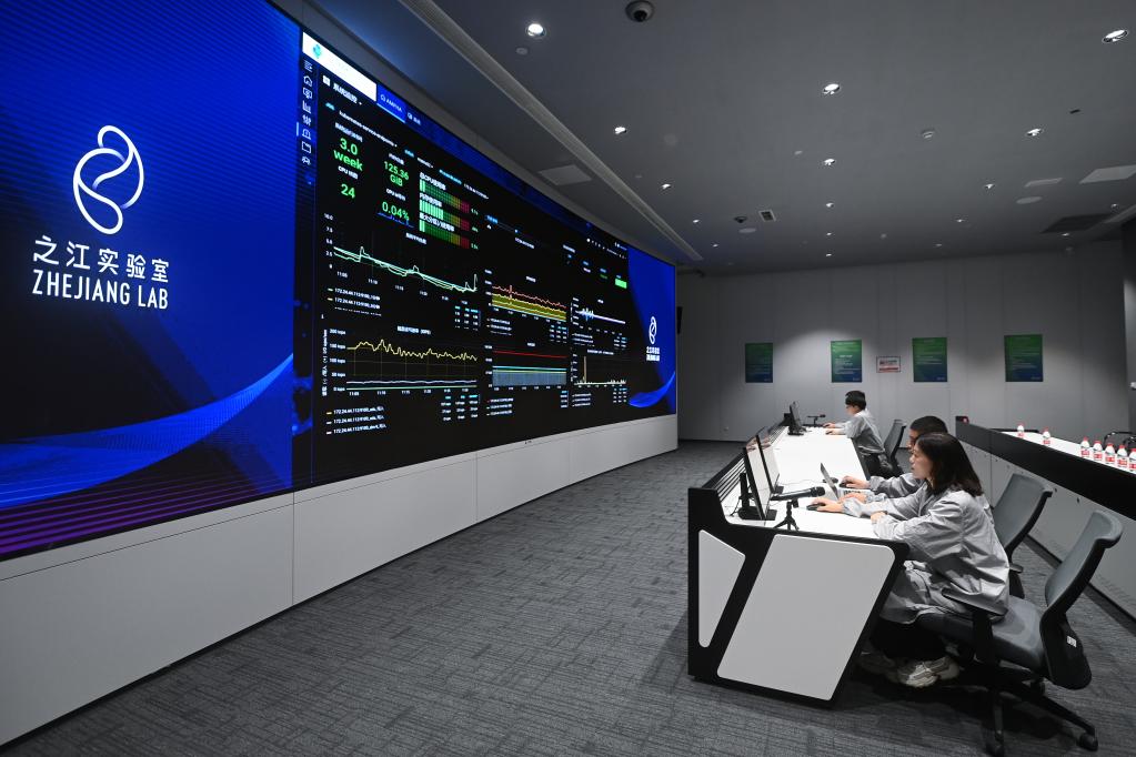 在位于杭州城西科创大走廊的之江实验室计算与数据中心,工程师们通过“之江云”系统监测服务器集群的运行状态(2022年6月23日 新华社记者黄宗治摄)。