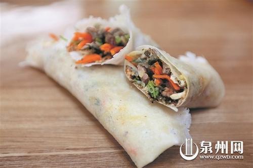 泉州清明节的食俗是吃“润饼菜”和“清明馃”,当为古时寒食节食俗之遗风。“润饼菜”是以面粉为原料擦制烘成薄皮,俗称“润饼”或“擦饼”,再卷胡萝卜丝、肉丝、蚵煎、芫荽等混锅菜肴,即可食用,甜润可口。