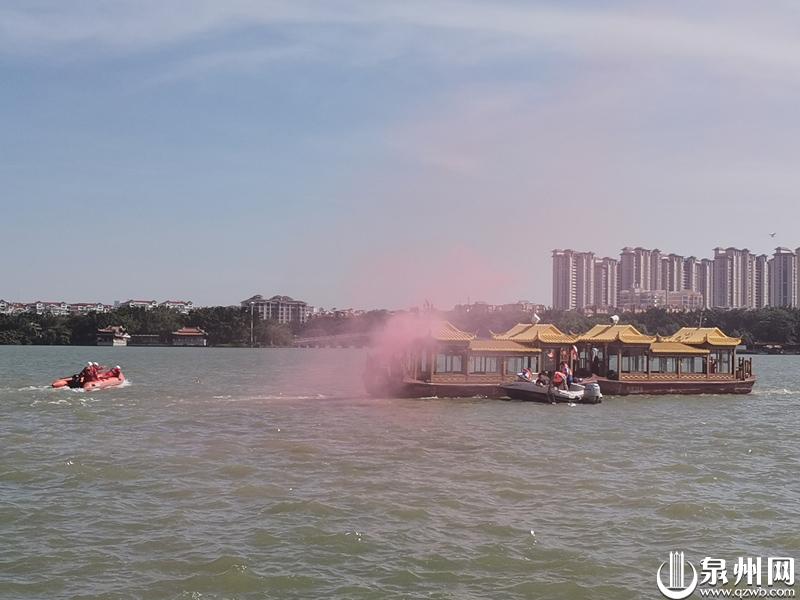 本次演练模拟对景区水上船舶发动机冒烟、失去动力的险情进行救援,共设7个科目,包括启动应急响应、景区交通管制人员疏散、客船冒浓烟船上人员转移、O型救援、应急救护、现场询问、船只灭火及拖带转移。泉州市交通运输综合执法支队执法三大队、泉州西湖公园服务中心、泉州市公安局清源派出所、丰泽区北峰街道社区卫生服务中心、福建迅捷防汛抗旱服务有限公司、泉州市西湖游船码头等演练队伍参与了此次模拟演练。