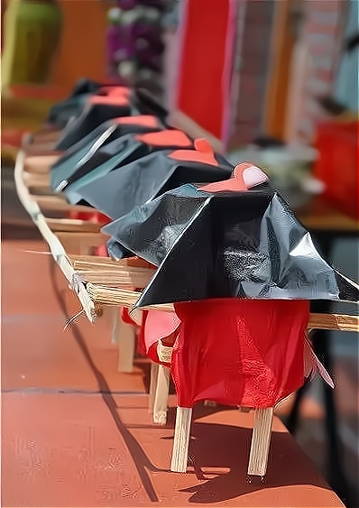 临近七夕,泉州街市上可看到一串串七仙女的轿子,用竹篾扎成的,七顶轿子并成一排。与之相伴出现的,还常有“亭子”,被称为“七娘妈亭”。