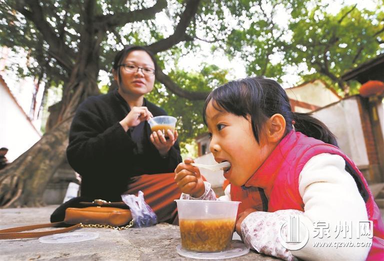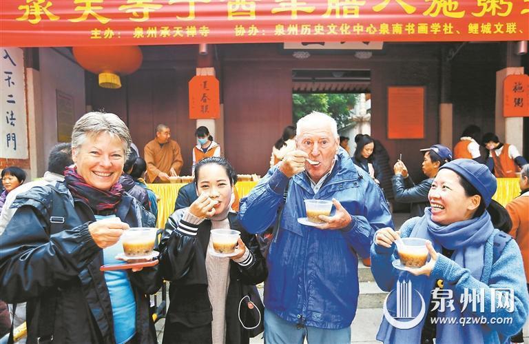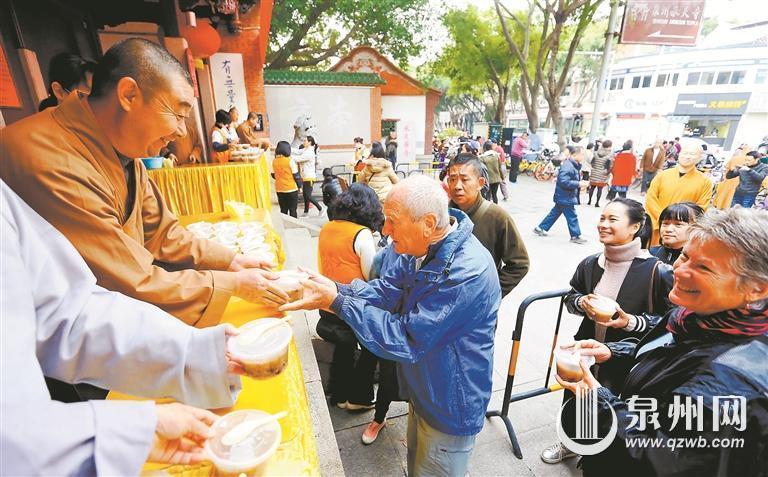 在泉州,还有不少人家通过寺庙施粥等方式品尝腊八粥。每年腊八,泉州少林寺、承天寺都会照例为民众广施腊八粥。承天寺姚秘书告诉记者,今年腊八粥的配方也与往年差不多。泉州鲤城海滨金山社区居委会赵主任介绍说,辖区有一位居民在浙江做企业,今年他将再次从浙江一家寺庙带回一些腊八粥,送给辖区内的贫困户和老人吃。